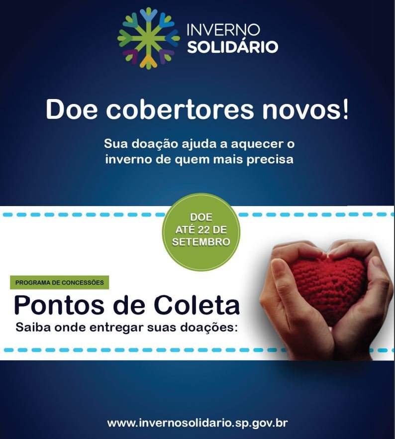 Araras, 2 de julho – A Arteris Intervias está apoiando, a partir desta quarta-feira (01/07), a campanha Inverno Solidário, que busca arrecadar cobertores novos que serão doados a entidades e instituições filantrópicas para aquecer os mais necessitados durante o período de temperaturas baixas. A ação é conduzida pelo Fundo Social de Solidariedade do Estado de São Paulo e viabilizada pela Agência de Transportes do Estado de São Paulo (ARTESP). Na região de atuação da concessionária, que cruza os municípios de Araras, Rio Claro, Leme, Pirassununga, Engenheiro Coelho, Mogi-Miram e Itapira, haverá 15 pontos de coleta (confira a lista abaixo).