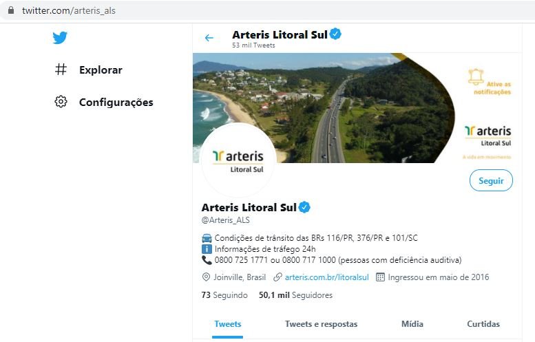 Quinta-feira, 22 de julho. Com boletins sobre as condições de tráfego e atendimento 24h aos usuários que trafegam pelas rodovias BR-101/SC, BR-376/PR e BR-116/PR (Contorno Leste), o perfil da Arteris Litoral Sul atinge a marca de 50 mil seguidores no Twitter. A conquista é o resultado de um trabalho expressivo na plataforma que recebe diariamente atualizações rápidas, transparentes e precisas sobre o trecho.