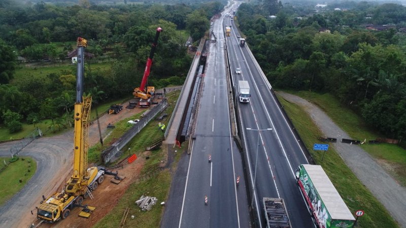 Trecho onde acontecem obras de reforma e ampliação de pontes, na região de Joinville, irá operar com uma faixa no sentido sul - de sábado até terça-feira. Veja mais fotos em: https://www.flickr.com/photos/arterisbr/albums/72157714286491881