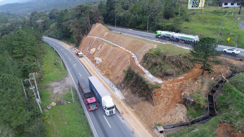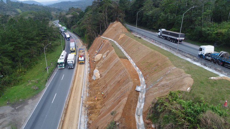 A concessionária segue com o cronograma de obras nas encostas e taludes no trecho de serra, e com o monitoramento 24h do trecho, atuando para prevenção e segurança diante de qualquer adversidade climática, como por exemplo chuvas intensas em curto período.