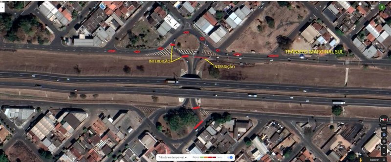 O tráfego sentido sul da marginal será interditado no entroncamento da Rua Francisco Alves com a Rua Pedro Scandar para os usuários que seguem em direção a Rua Professor Joaquim de Faria com a intenção de acessar a marginal. O usuário deve utilizar o retorno na rotatória a fim de acessar a marginal norte até o retorno do km 311,800 onde poderá seguir pela marginal sul.