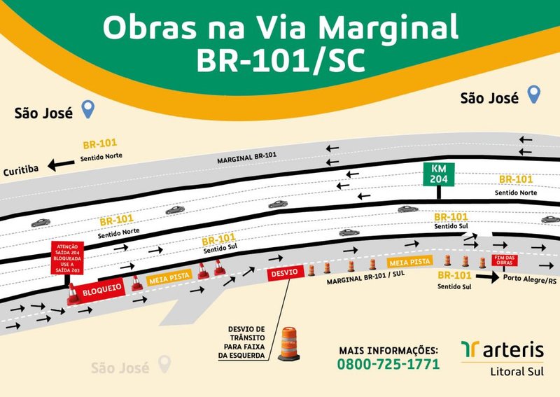 Sexta-feira, 21 de janeiro. A partir da noite de domingo, 23 de janeiro, serão realizadas duas intervenções na altura do km 204 da BR-101/SC, em São José, com modificação no trânsito da via marginal sul. As mudanças têm relação com obras para implantação de empreendimento comercial na região – com duração de 60 dias.