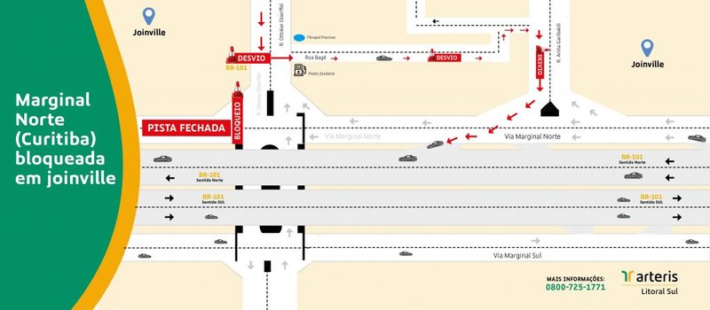 Sábado, 29 de janeiro. A Arteris Litoral Sul comunica o bloqueio temporário de trânsito, previsto para manhã de segunda-feira, 31, na ligação da Rua Ottokar Doerffel com a via Marginal Norte da BR-101 (km 41,2). A restrição ocorre para realocação de rede elétrica.