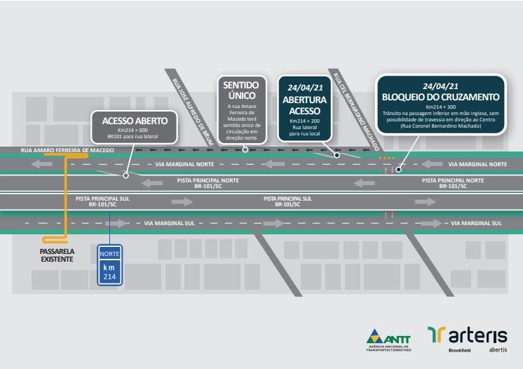 Na quarta-feira, dia 21, o cruzamento entre a via marginal da BR-101 e a rua Papa Paulo VI na altura do km 211,7 será fechado. Para os motoristas que precisarem entrar na rua local, será aberto um acesso no km 211,6, atendendo essa necessidade.