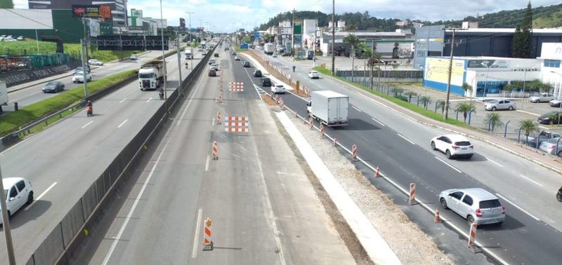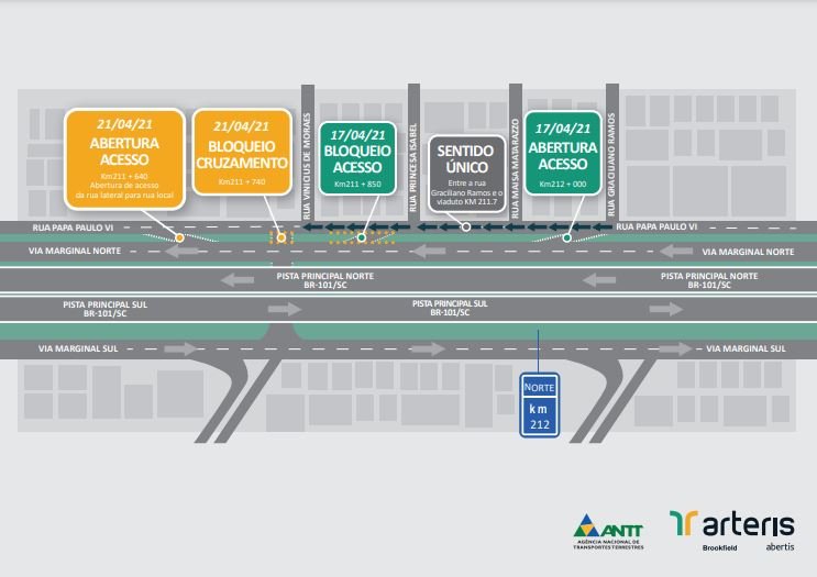 Já no sábado, dia 24, o cruzamento no km 214,3 que dá acesso da via marginal à região central de Palhoça pela rua Coronel Bernardino Machado será fechado. A entrada no Centro poderá ser feita através do acesso que será aberto no km 214,2 para a rua Amaro Ferreira de Macedo, que terá sentido único de circulação na direção norte, para posteriormente entrar na rua José Alfredo de Brum.
