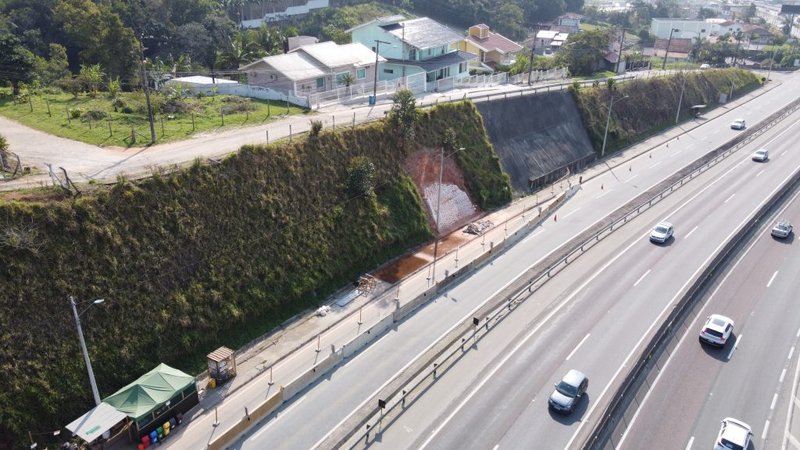 Trecho em que a concessionária realiza obras para recuperação de encosta - em Biguaçu, nas margens da pista sul da BR-101/SC[/caption]